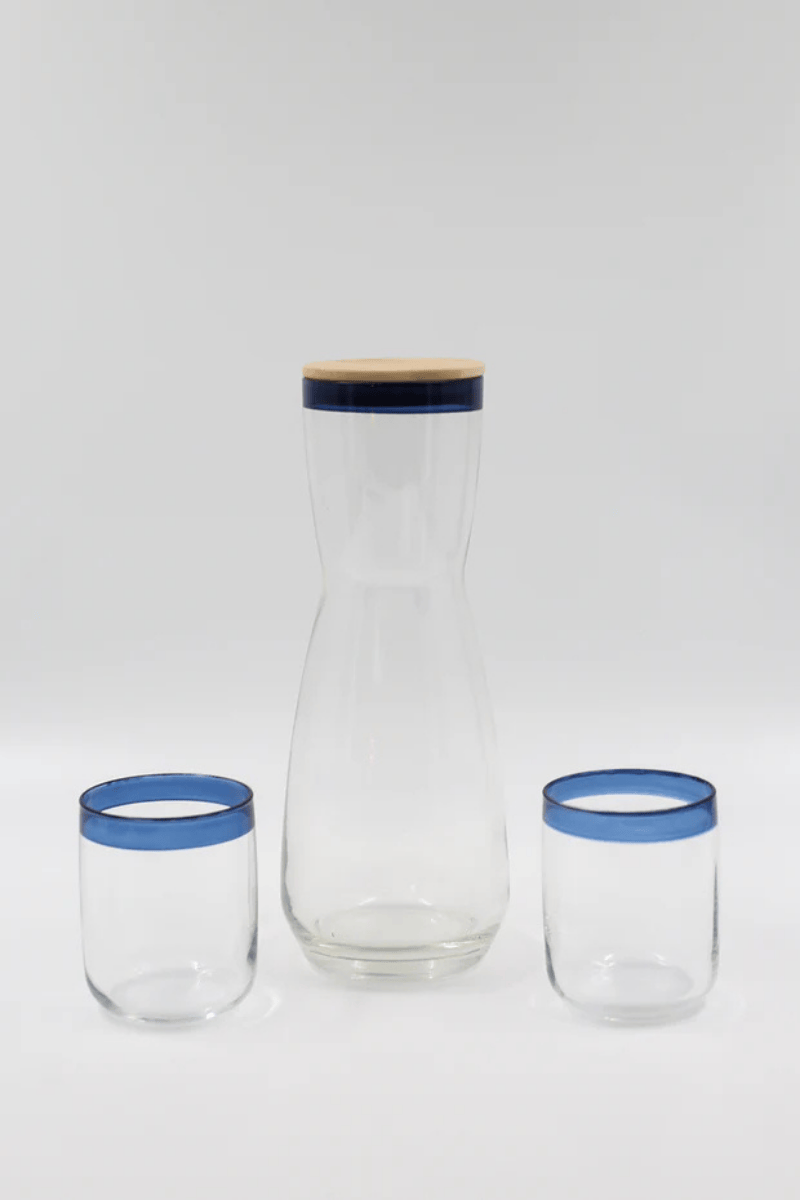 Lacivert Linea 3 Parça Su Seti paket içeriğinde 2 adet su bardağı ve 1 adet karaf bulunur. Uzun süreli kullanım için elde yıkanması tavsiye edilir.