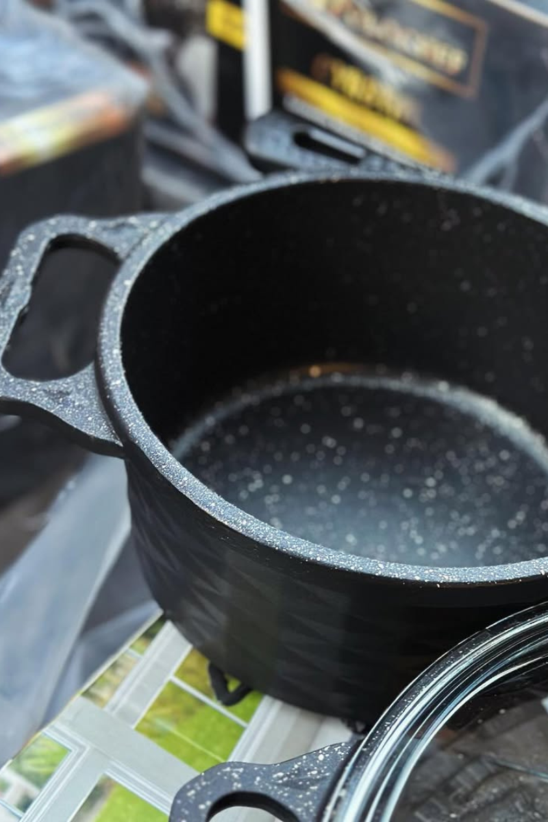Ergonomik tasarımı ile kullanım kolaylığı sağlar. Yanmaz bakalit kulpları güvenli bir tutuş sunarken cam kapakları sayesinde pişirme sürecini rahatça takip edebilirsiniz. Crytal Granit Döküm Tencere Seti 7 Parça, hem günlük mutfak kullanımı hem de özel davet sofraları için ideal bir seçenektir.