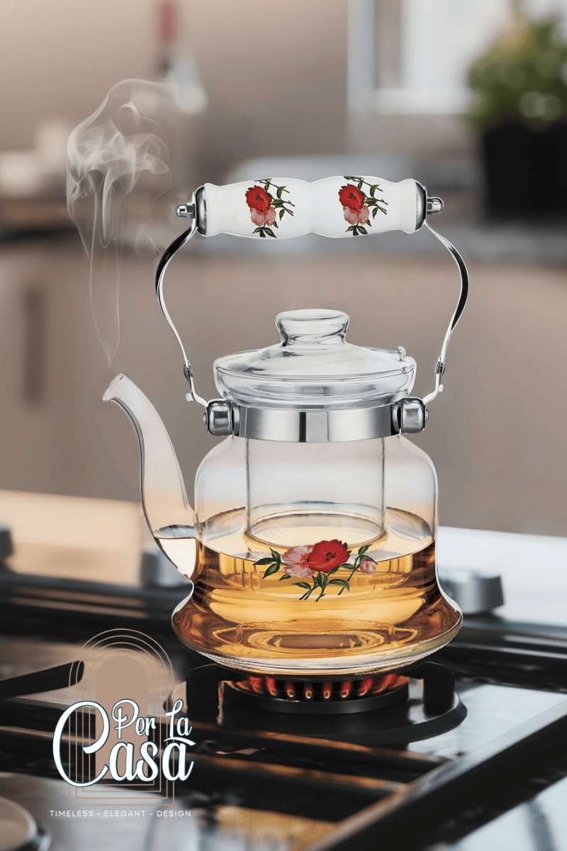 Rosellea Porselen Saplı Cam Demlik 900 ml, zarif tasarımı ve dayanıklı yapısıyla çay keyfinizi daha özel hale getirir. Isıya dayanıklı cam gövdesi sayesinde yüksek sıcaklıklara karşı dirençlidir ve güvenli kullanım sunar.